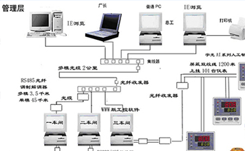 關(guān)鍵詞:光纜 監(jiān)控 以太網(wǎng)一、概述四川制藥股份有限公司在全廠局域網(wǎng)設(shè)計中采用光纖深入動力車間兩臺喬納森公司550空壓機(jī)運(yùn)行情況控制,加入調(diào)度管理系統(tǒng),將以太網(wǎng)滲透到工業(yè)現(xiàn)場從而實(shí)現(xiàn)辦公自動化與工業(yè)自動化的無縫結(jié)合,給廠部調(diào)度室、總工隨時決策提供幫助。充分運(yùn)用AI系列智能儀表組建現(xiàn)場總線型計算機(jī)監(jiān)控系統(tǒng)連接到局域網(wǎng)上共享信息資源。使車間、調(diào)度室、廠辦計算機(jī)組成對等以太網(wǎng),實(shí)現(xiàn)資源共享管控一體化。二、系統(tǒng)架構(gòu)我們將傳統(tǒng)的服務(wù)器下放至現(xiàn)場充當(dāng)服務(wù)器,計算機(jī)中安裝WWW網(wǎng)絡(luò)版工控軟件,現(xiàn)場的儀表數(shù)據(jù)以數(shù)字信號的形式由服務(wù)器采集并保存于服務(wù)器中。 調(diào)節(jié)器AI-808AXL2L2S4巡檢儀AI-706MAJ0J0J0L2L2S AI表采集的壓力、流量、溫度、位移、液位、流量等數(shù)據(jù)存儲在客戶服務(wù)器WWW網(wǎng)絡(luò)版工控軟件數(shù)據(jù)庫,在計算機(jī)上按裝100M網(wǎng)卡,接上光纖收發(fā)器,通過四芯光纜送至500米(可達(dá)