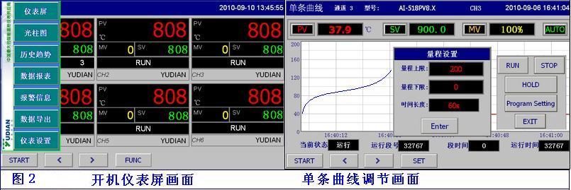 1、數(shù)據(jù)采集及控制:軟件系統(tǒng)從工業(yè)現(xiàn)場溫度控制器采集測量值,編輯實時曲線,可同時顯示8條實時曲線,用顏色來區(qū)別。曲線顯示可選百分比與實時曲線2種圖。也可屏蔽其他曲線,顯示單條曲線。呈現(xiàn)的實時數(shù)據(jù),并存入系統(tǒng)內數(shù)據(jù)庫,以便日后數(shù)據(jù)查詢等使用。在流程圖、實時趨勢圖或儀表畫面上: