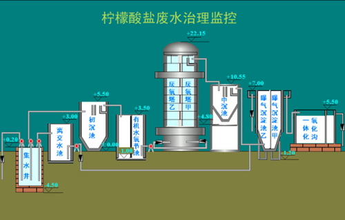 宜興協(xié)聯(lián)檸檬酸廢水處理廠采用厭氧加好氧處理工藝,其中好氧部分采用SBR法處理。SBR是處理高濃度有機廢水的理想途徑之一。一期設(shè)計日處理100立方/小時,設(shè)2座爆氣池2座厭氧塔,氧化溝,有機調(diào)節(jié)池等12座處理池??刂圃O(shè)備布置分散,要求實現(xiàn)總線型遠(yuǎn)程檢測控制。